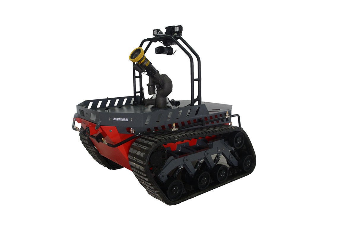 該機器人采用橡膠履帶式行走結構,行走速度為1.5米/秒,無線遙控達200米范圍,配有兩個消防水帶專用接口,通過無線遙控可以靈活控制消防炮噴射方向,炮筒可控制向上旋轉70度,噴出的水柱可達80-100米,可實現霧化/直流切換、仰射/俯射角度切換、左右搖擺等功能,具有遠程遙控、機動性強、噴射流量大、射程遠等優點。此外,機身還配置了攝像頭,可以通過圖像傳輸功能及時反饋火場內情況,為消防員指揮決策提供信息輔助。該機器人還有一個重要的作用,就是運送器材裝備或傷員。在不需要機器人出水滅火的情況下,可以把它身上的水炮拆卸下來,將滅火救援一線需要用到的器材裝備放在平臺上,由司機通過遙控操作就能送到戰斗員手中,一來避免了戰斗員來回跑,二來可以緩解火場中警力不足的問題。據了解,該機器人最多可載重約600斤,除了器材裝備,還能運送傷員,伸展后可達1.75米長,剛好能躺下一個人。